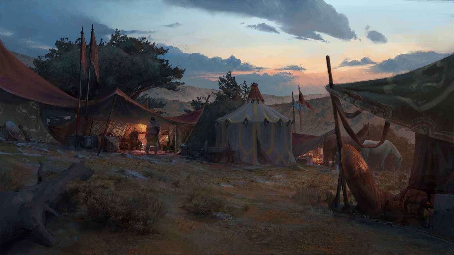 Auf dem Weg zu dem als Lazarett bezeichneten großen Zelt fällt dir zunächst kaum etwas besonders ins Auge. Wie schon bei deiner Ankunft im Lager ist die Grundstimmung augenscheinlich von Abneigung und einer erdrückenden Ernsthaftigkeit geprägt. Jedenfalls lassen alle Blicke auf deine Person und das stoische Werkeln aller sichtbaren Bewohner des Lagers diesen Schluss zu.